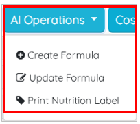 A new AI Operations option is now provided on the Lab Note Book tab on the Sample Management screen. To access AI‑powered tools for formula creation, updates, and nutrition label generation, move on to the Lab Notebook tab. Click the AI Operations dropdown option. The available options in the dropdown are: