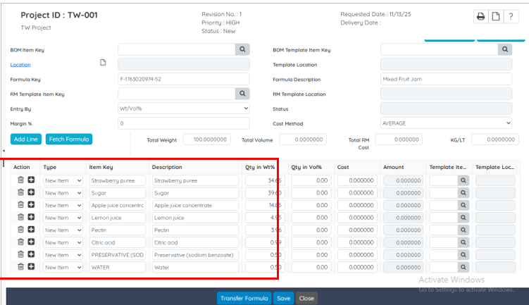 On clicking OK button, the system displays a prompt window. Write a prompt in your natural language to create a formula. Say, for instance, write “Create a formula for mixed fruit jam for producing with 3kg quantity.”