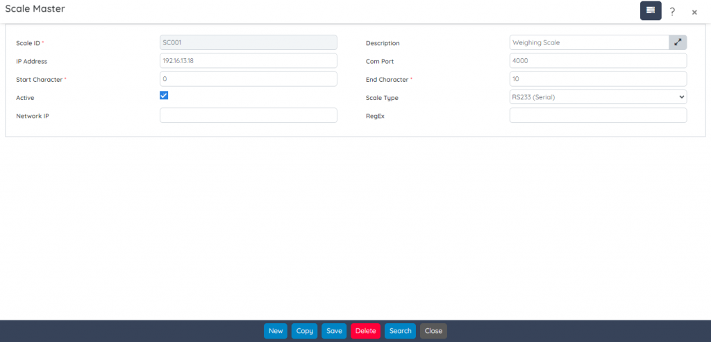 Use this screen to maintain weighing scales and associate them with the IP addresses of the machines where the Scale Agent is installed. You can add multiple scales on a single bin and can configure connection option to connect through Network (Ethernet/Wi-Fi) and specify the Network Scale IP address.