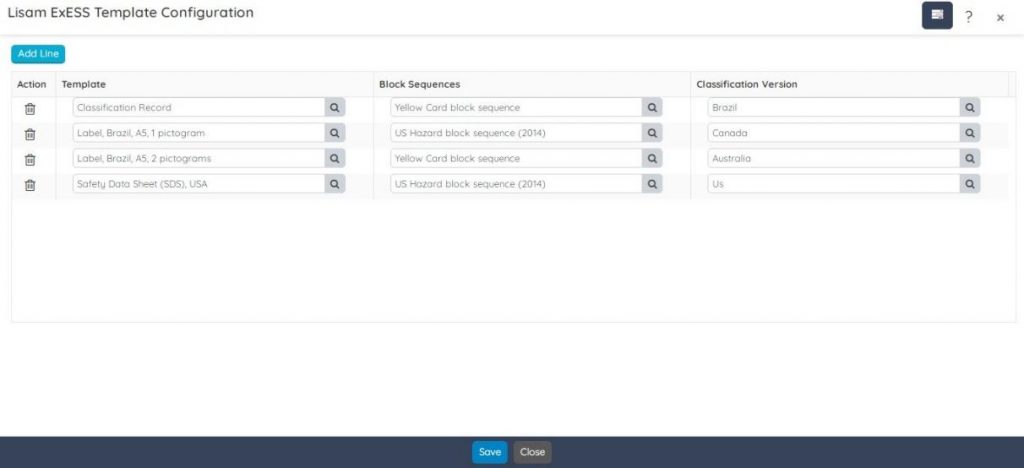 In Lisam ExESS the basic components used to print an SDS are a combination of template, block sequence, and classification version. You can define such required combinations on the Lisam ExESS Template Configuration screen.