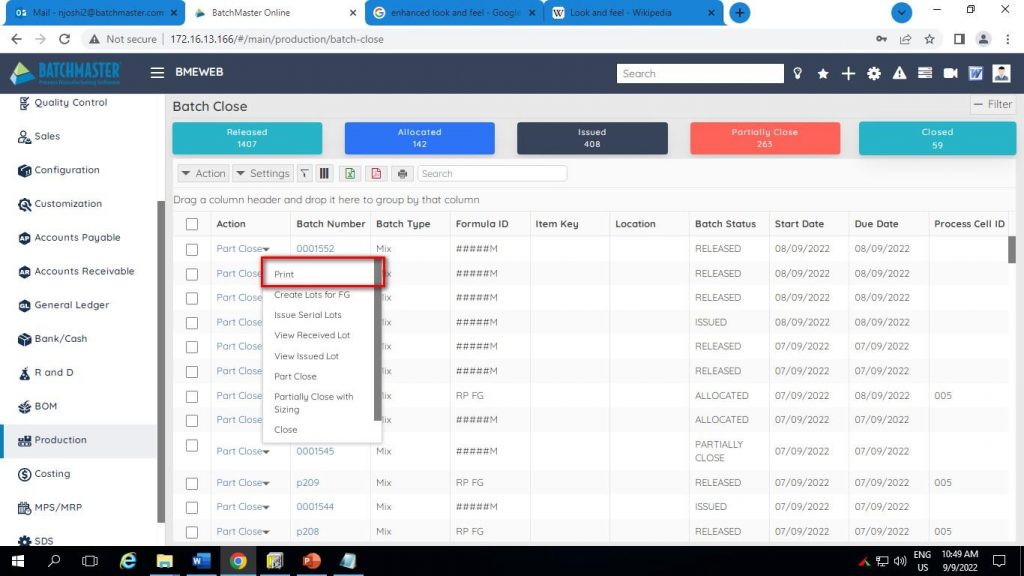 | 9 | Production Scheduling | Batch Ticket: Date filter increase, Date range selection and process cell selection |