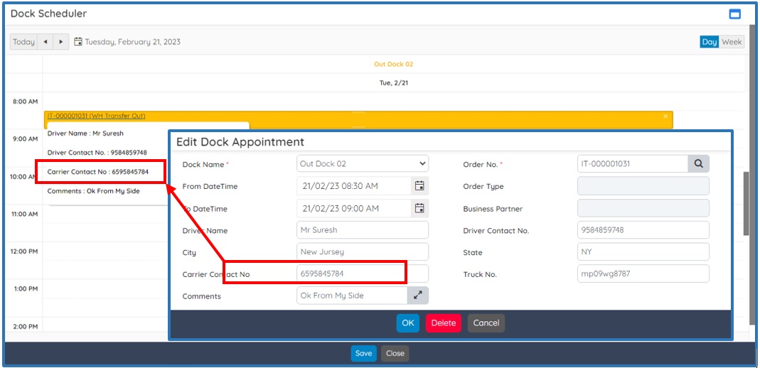 On the Dock Scheduler window, now the caption of the Shipping Contact No. is changed to Carrier Contact No.  The Carrier Contact No at the tooltip gets defaulted from the Edit Dock Appointment screen.